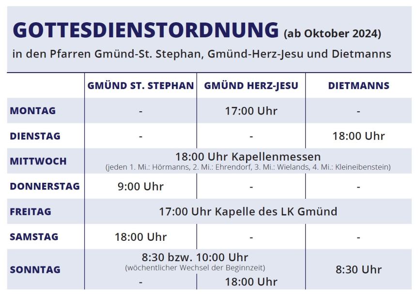 Freitag: 26. 12.; Stephanitag: 09. 00 Uhr Hl. Messe in der St. Stephan Kirche, 17. 00 Uhr: Schlussandacht. Keine Hl. Messe in Herz-Jesu und Dietmanns.